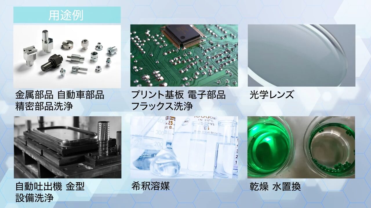 「eクリーン21N」はその非常に高い溶解力(KB値の高さ)と乾燥性を活かし、様々な分野での洗浄工程で幅広く採用されています。