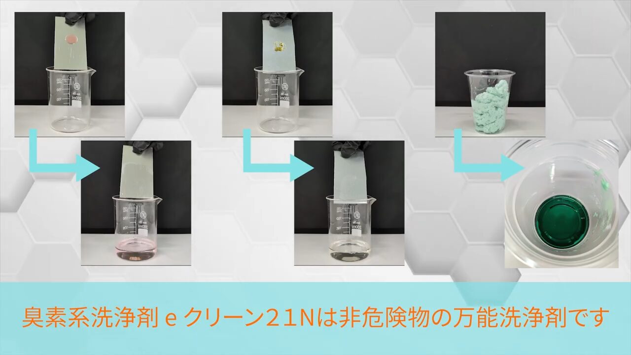 臭素系万能洗浄剤のスタンダード品「eクリーン21N」の実験動画をもとに、